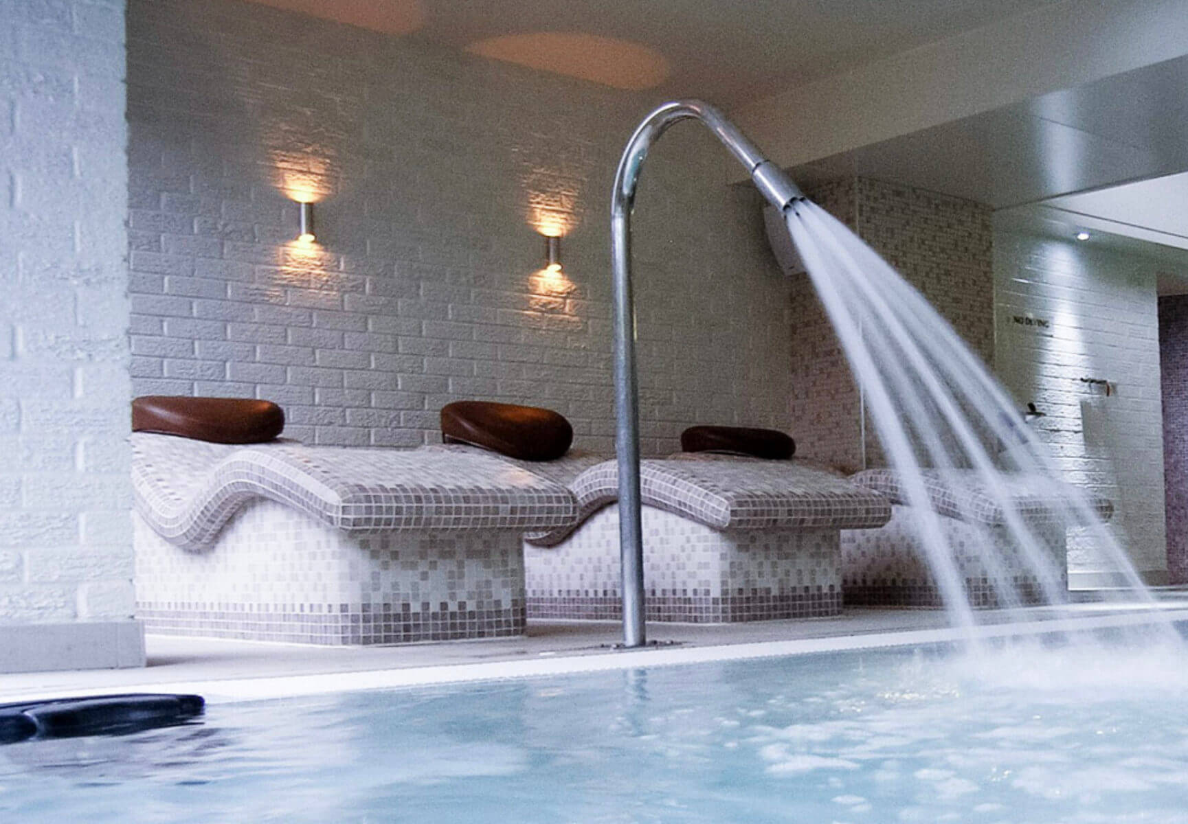 Hydrotherapy pool controlled at 37-38 degrees with 2 airbed loungers, heated tiled loungers, 2 water canons, and a volcano air pad.